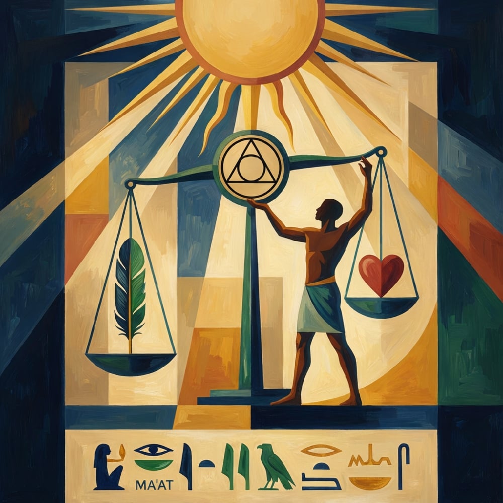 Recurring motifs of circles, triangles, and radiant suns represent unity, structure, and source energy — the fundamental forces that shape both the universe and human consciousness. Scales, hearts, feathers, and symbolic forms evoke themes of balance, truth, and inner alignment. The figures depicted are not portraits of individuals but embodiments of universal roles: the builder, the balancer, the seeker, the force that moves creation forward.