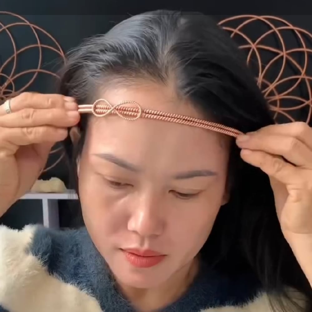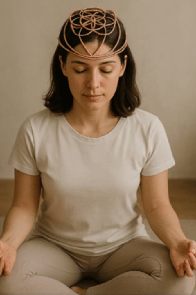 2. Hand-crafted from pure twisted copper, the Copper Resonance Headband is designed to stabilise and amplify the body’s natural electromagnetic field. The dual-coil infinity knot at its centre acts as a phase-balancing junction, equalising charge between the left and right hemispheres while creating a mild standing-wave effect across the frontal cortex — the zone associated with focus, intuition, and field coherence.