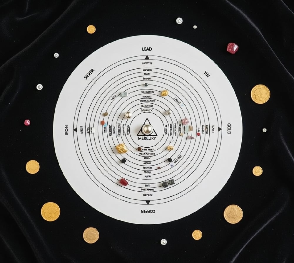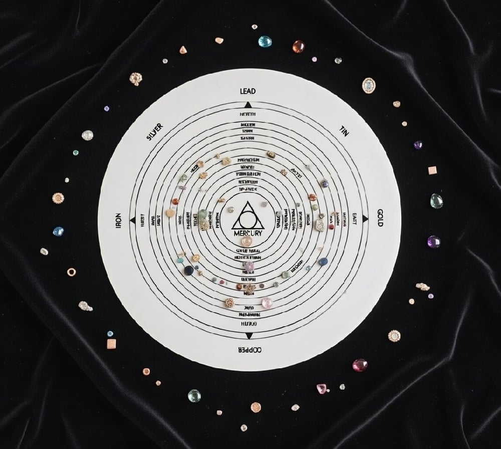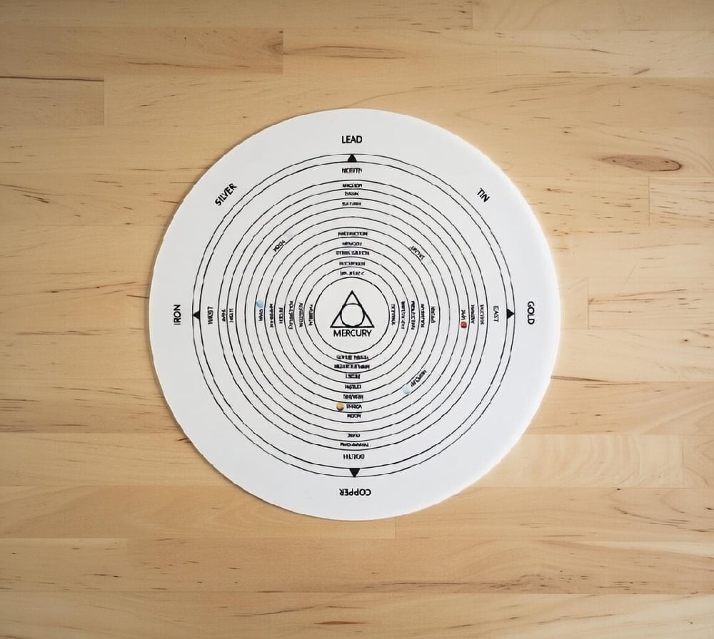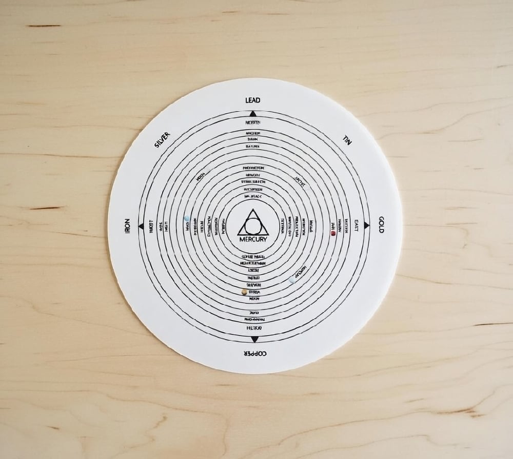 So instead of reading the system line by line, this disk lets you see how everything interlocks at once — planets influence states, states align with directions, directions pair with metals, metals relate to grounding and conductivity, and all of it routes back through Mercury — the operator.