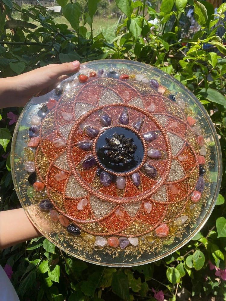 A handcrafted energetic field plate built from a full copper spiral grid, crystal-frequency matrix, and a central dense black anchoring core. This device is engineered to stabilise, clear and amplify the surrounding biofield through layered geometry, mineral resonance, and conductive copper pathways.