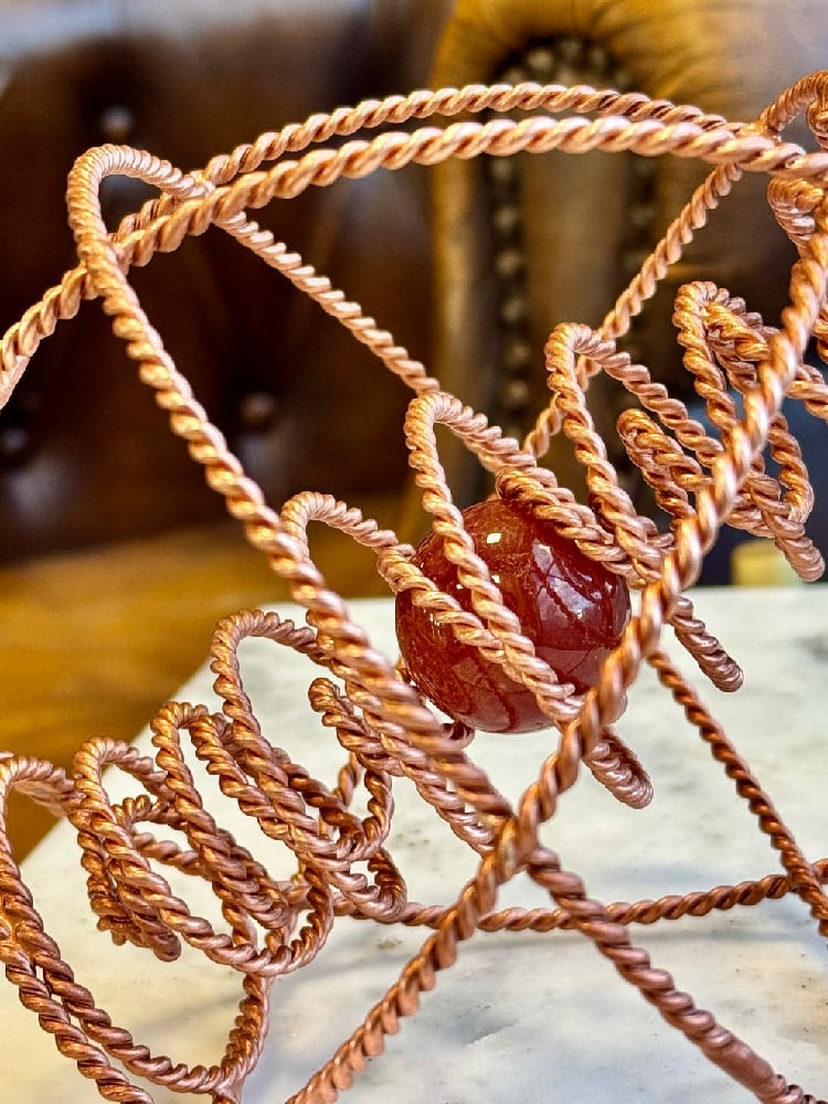 At the centre lies a crystalline node — available in calibrated variants such as Green Aventurine (growth frequency), Rose Quartz (emotional harmonisation), Citrine (field expansion), Amethyst (clarity frequency), or Carnelian (vital force). The copper lattice operates as a dual-helical transmitter: each spiral pair acts as a phase-coupled conductor that converts ambient electromagnetic noise into coherent harmonic spin. This process is not mystical; it is structural. Copper’s conductive lattice amplifies and orders the crystal’s piezoelectric field, resulting in a measurable shift in field symmetry detectable with sensitive EM instruments or by experienced Operators through tactile resonance response.