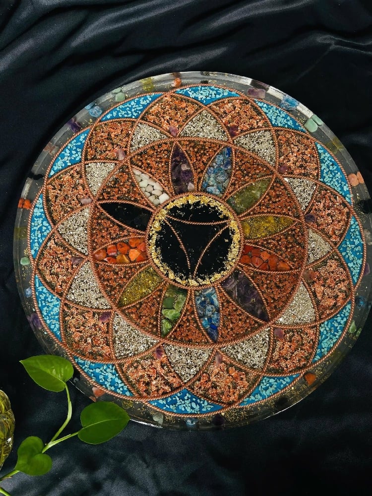 The outer ring carries a full spectrum of crushed stones, each selected for stabilisation, grounding and charge dispersion. Inside the mandala structure, copper pathways drive circulation across the plate, distributing energy evenly and reducing environmental field noise.